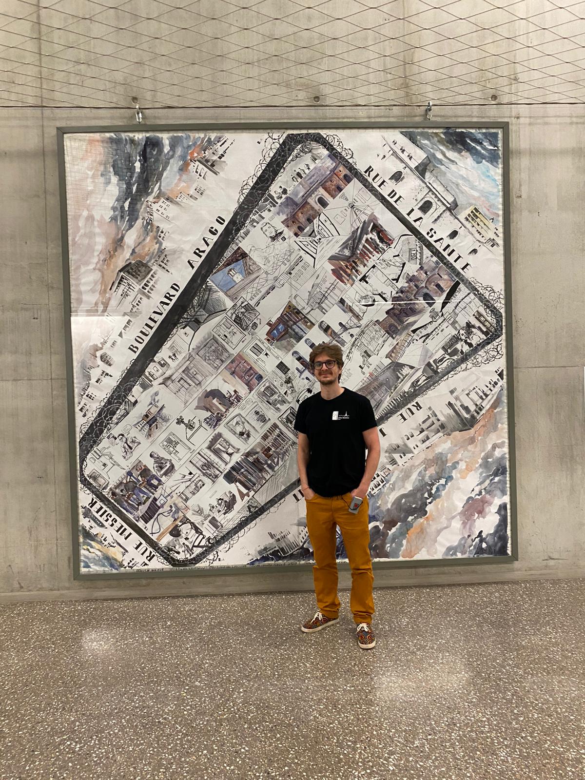 En complément des ateliers, nous avons eu accès à l’ensemble de la prison pour y dessiner librement. Les productions artistes et des détenus ont ensuite été rassemblées dans une fresque de 3×3 mètres (la taille d’une cellule), qui a été exposée à la Conciergerie de Paris avant d’être rapatriée de façon permanente pour être exposée dans le couloir central de la prison, appelé « la rue ».